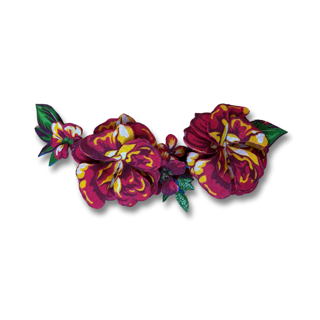 Flores artesanais em tecido chita com efeito 3D. Use de várias formas: em roupas, bolsas e até na decoração. Um toque vibrante e autêntico para composições criativas e tropicais.