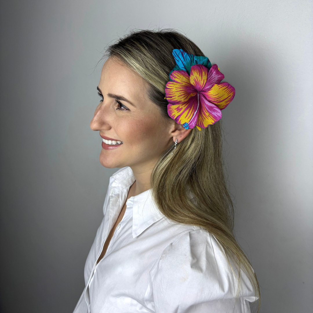 Flor artesanal em tecido chita com efeito 3D, nas cores rosa, amarelo e azul. Ideal como acessório para cabelo, roupas ou bolsas. Um toque vibrante e autêntico para compor looks criativos e tropicais.
