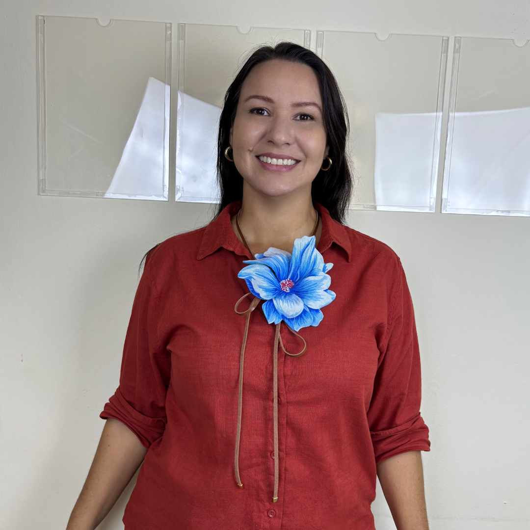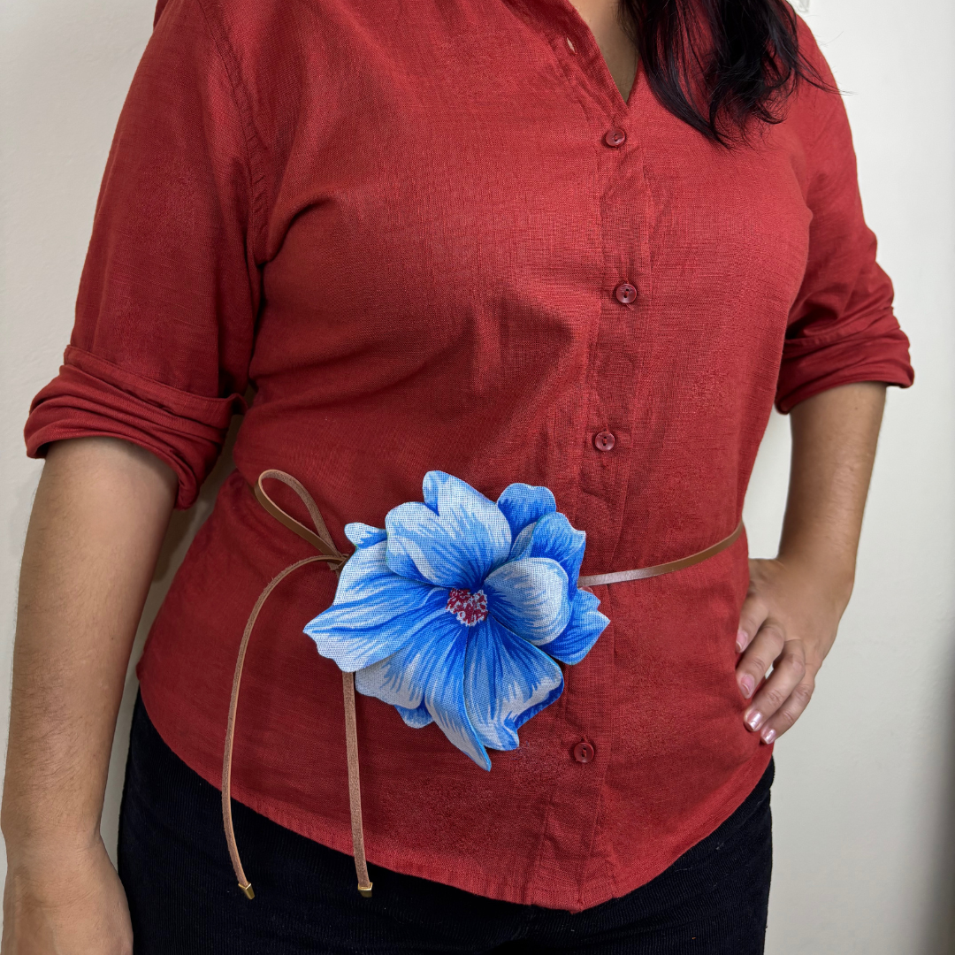 Flor artesanal em tecido chita com efeito 3D, nas cores azul escuro e azul claro. Ideal como acessório para cabelo, roupas ou bolsas. Um toque vibrante e autêntico para compor looks criativos e tropicais.