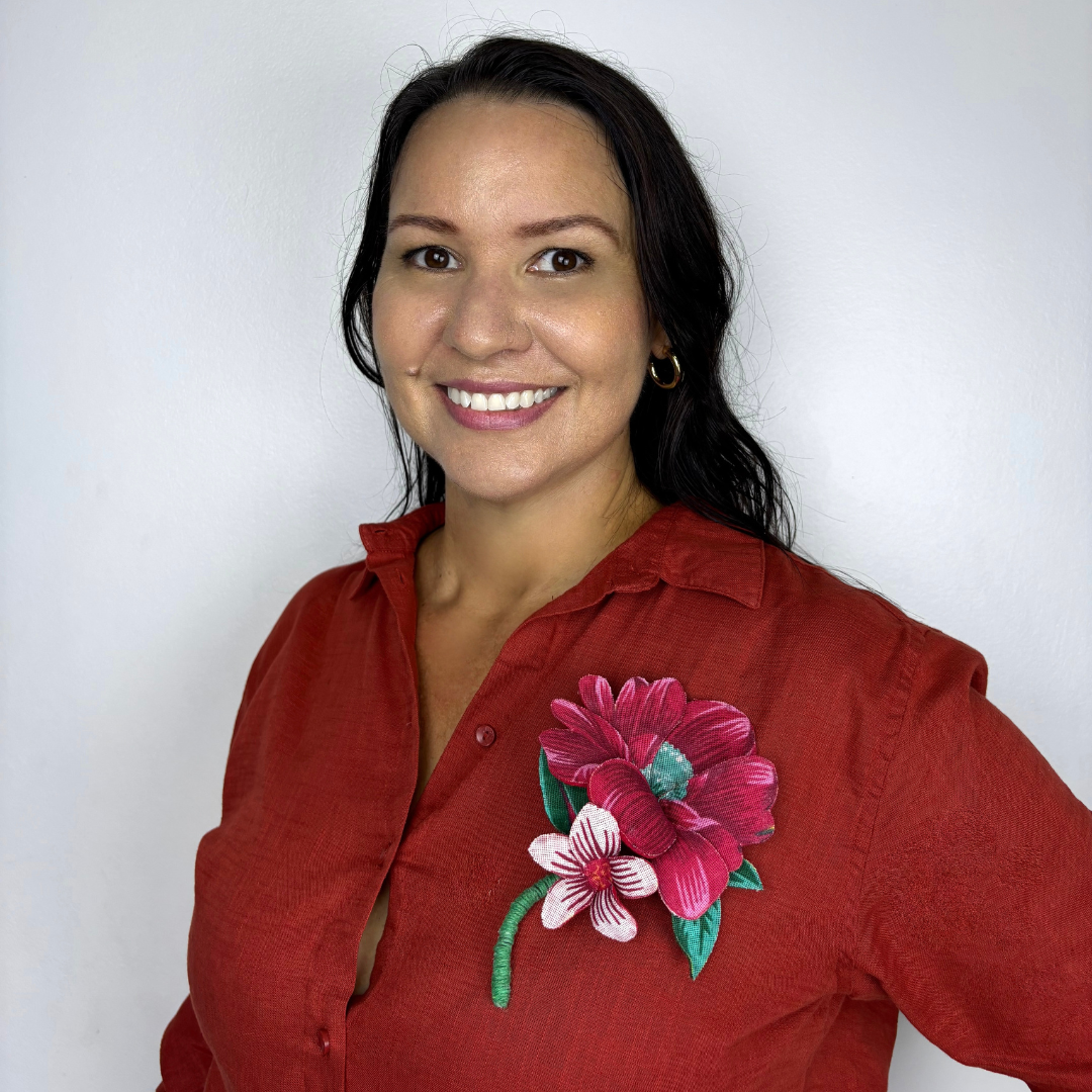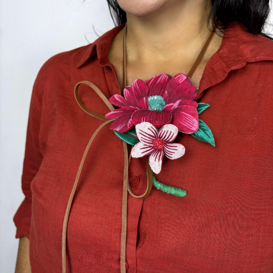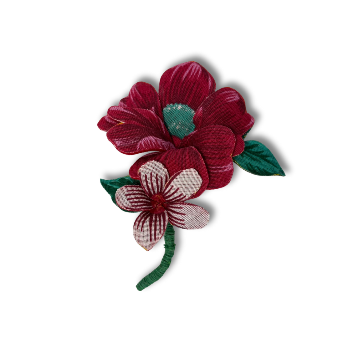 Flor artesanal em tecido chita com efeito 3D, nas cores vermelha, branco e verde. Ideal como acessório para cabelo, roupas ou bolsas. Um toque vibrante e autêntico para compor looks criativos e tropicais.