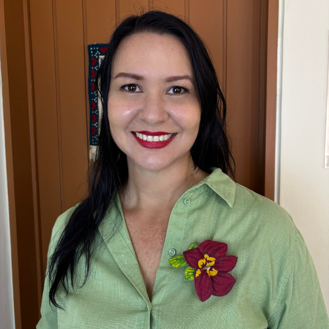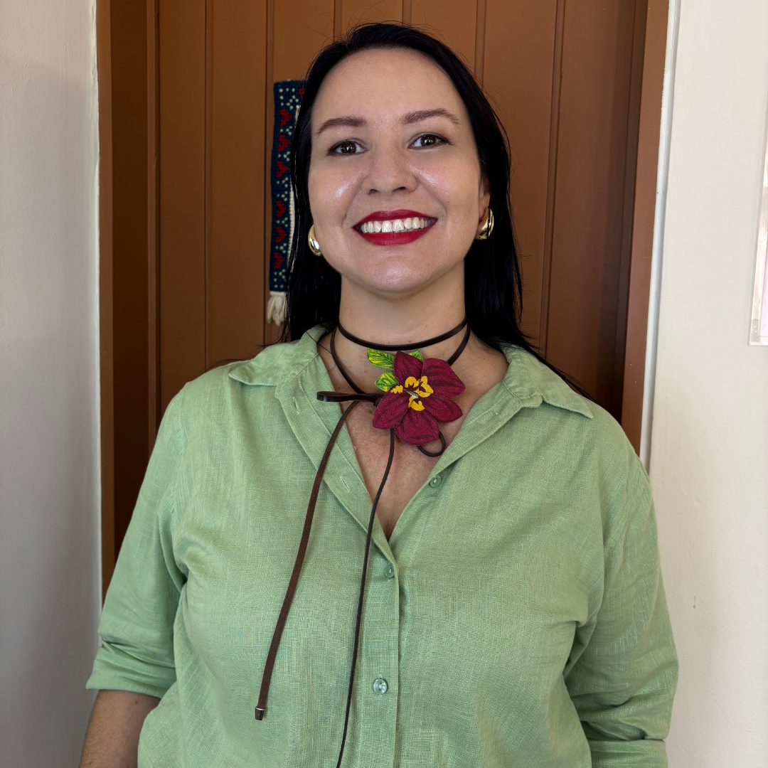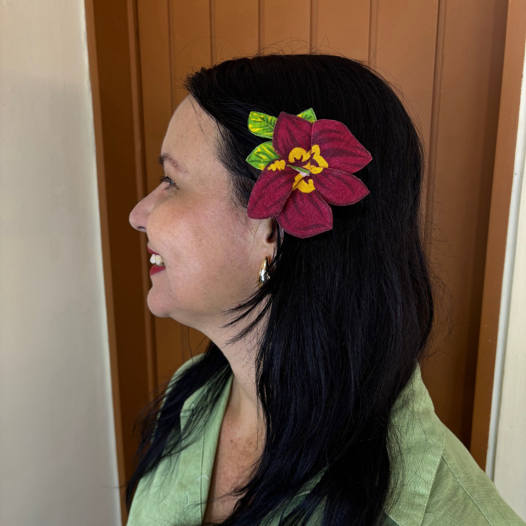 Flor artesanal em tecido chita com efeito 3D, nas cores vermelho, amarelo e verde. Ideal como acessório para cabelo, roupas ou bolsas. Um toque vibrante e autêntico para compor looks criativos e tropicais.